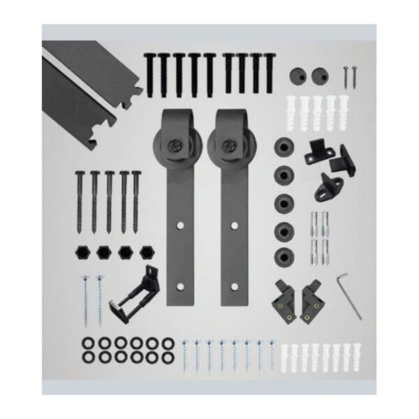 Sliding system for interior doors made of wood. Maximum weight of sheet up to 80 kg. 2-meter rail. Easy installation. Sliding system for interior doors made of different types of wood, from MDF to Natural Pine, Rustic Pine, etc. The Kit includes all the necessary components to assemble 1 door.