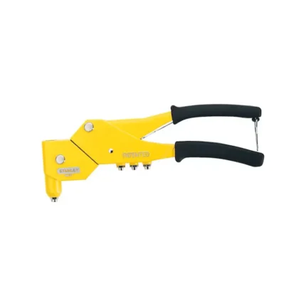 The Stanley Swivel-Head Manual Riveter offers both right-angle and straight-on riveting with a simple twist of the rivet head. The tool is constructed of die-cast metal for durability. This rivet tool features a long handle to make it easier to squeeze with less effort.