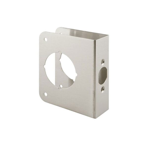 - Contemporary high-security reinforcer surrounds door edge, face bore and accepts single-cylinder or double-cylinder deadbolt.