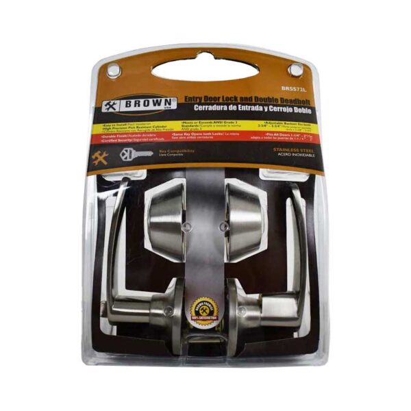 The Brown USA Entry Door Lock Combo pack provides two locking points: keyed entry and a double-cylinder deadbolt. The keyed entry lever set has been newly designed and easily mounts to doors 1-1/4 in. to 2 in. thick with the included hardware. This easy-to-install set features heavy-duty solid brass cylinders with a durable Stainless-steel finish.