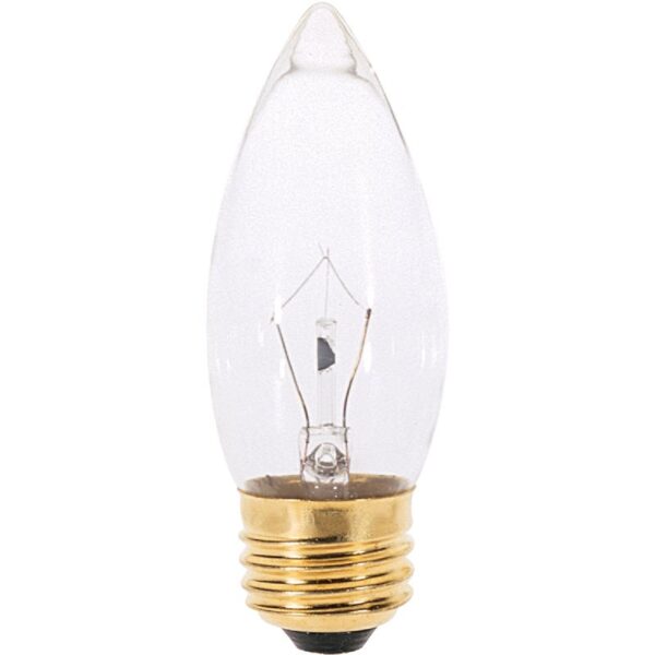 - B11, decorative, blunt tip, incandescent light bulb with medium brass base.