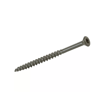Green exterior screw with a 6-lobed star drive for quick engagement and torque control. Countersinking bugle head prevents popping and provides a smooth finish. Features extra coarse thread, Type 17 point, and PrimeGuard Plus polymer coating for corrosion resistance. Ideal for decks, fencing, siding, and general exterior projects, especially with pressure-treated lumber, cedar, and redwood.
