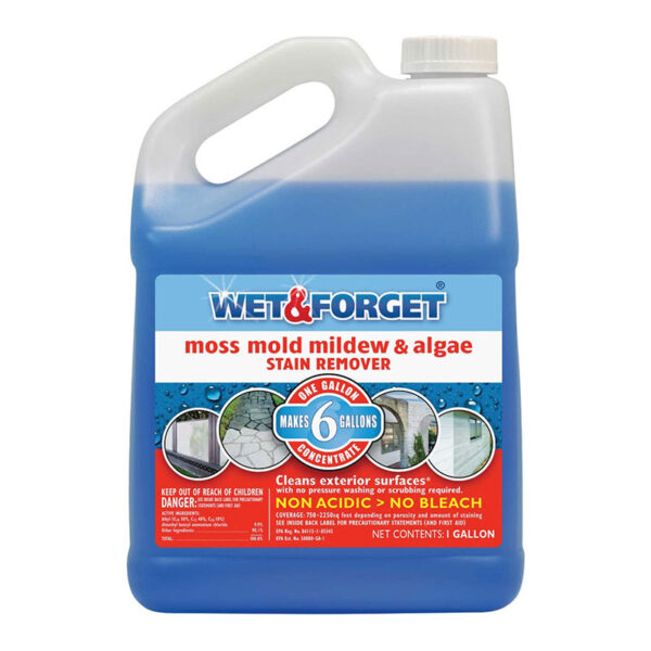 Wet & Forget is the easy, one-step solution to removing outdoor moss, mold, mildew, and algae. EPA (Environmental Protection Agency) registered. Non-caustic, non-acidic, and contains no bleach or phosphates. No scrubbing, rinsing, or power washing is required. Safe for all outdoor surfaces. Ideal for cleaning vinyl siding, decks (wood and composite), porch steps, window ledges, boat seats, play equipment, and roofs. The product works gently over time. Safe around plants and landscaping when used as directed.