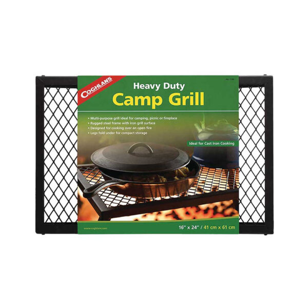 Heavy-duty steel frame camp grill. Ideal to use when cooking with cast iron cookware. The heavy gauge metal frame and iron mesh grill surface are supported by sturdy legs that fold underneath for compact storage. Powder-coated finish for corrosion resistance.