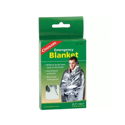 Emergency blanket. An important emergency product to keep on hand in cold weather. Made of aluminized non-stretch polyester, this large blanket will reflect heat to the body and prevent heat loss in cold conditions. The material will stay flexible even in freezing temperatures and is also windproof and waterproof.