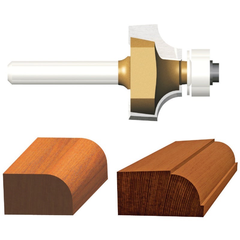 Use to create decorative edging and drop-leaf table joints. Create beading profiles with corner round bits by exchanging the 1/2″ bearing with a 3/8″ bearing (included with bit). Carbide tipped. 1/4″ shank.