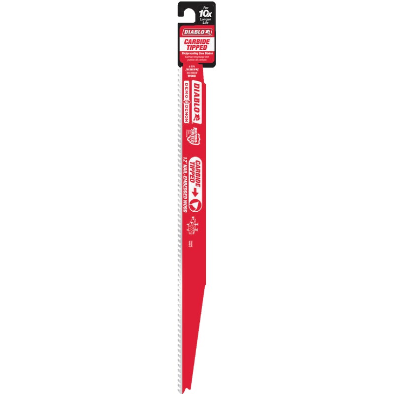 Diablo Demo Demon Reciprocating saw blades are specifically designed for maximum performance in nail-embedded wood applications. These high-performance blades include carbide-tipped teeth for up to 10 times longer life versus standard blades. Perma-SHIELD nonstick friction-reducing coating and high-performance tooth design provide users with high performance and ease of use.