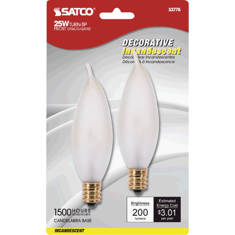 Satco CA8 Incandescent Turn Tip Decorative Light Bulb with candelabra brass base.