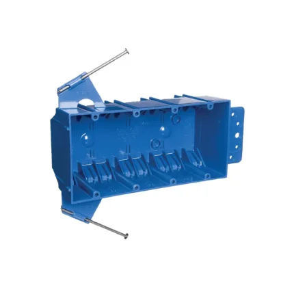 SuperBlue electrical box. Resists flexing and maintains rigid shape. Box will not break when hit with a hammer. Integrally molded cable clamps eliminate the need for press-in clips and metal clamps and are designed to nest or stack into each other, allowing for smaller packaging and less shelf space to stock.