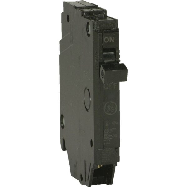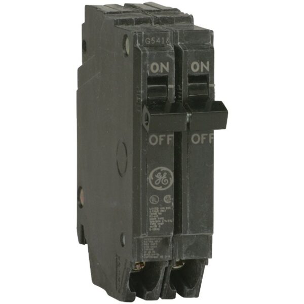 GE THQL circuit breaker. Features copper to copper connections with corrosion resisting tin plated stabs. Quick make/Quick break box type terminals. Handle trips to center position, giving a clear indication of a tripped breaker. 120 volt/240 volt. UL (Underwriter's Laboratories) listed.