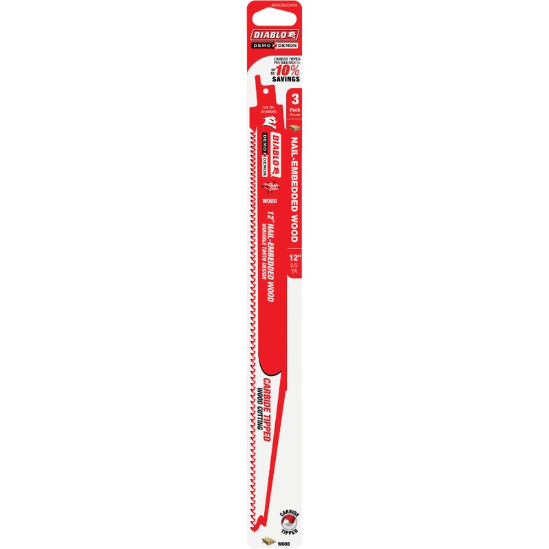 Diablo Demo Demon Reciprocating saw blades are specifically designed for maximum performance in nail-embedded wood applications. These high-performance blades include carbide-tipped teeth for up to 10 times longer life versus standard blades. Perma-SHIELD nonstick friction-reducing coating and high-performance tooth design provide users with high performance and ease of use.