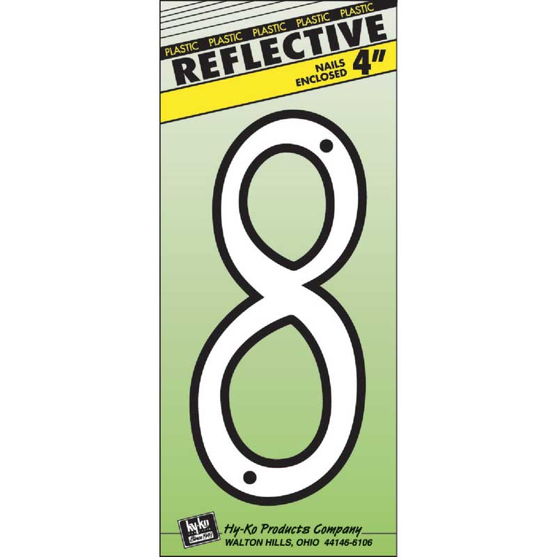 Reflective plastic raised script numbers. Comes with mounting nails. Aluminum color face on black plastic. Numbers 0 thru 9.