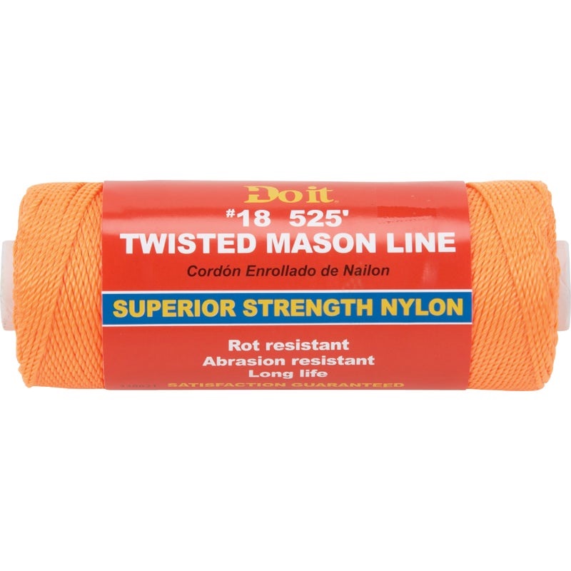 Do it 525 Ft. Fluorescent Orange Twisted Nylon Mason Line. 100% nylon construction. Twisted construction. Superior, rot-proof. Resistant to oil, grease, gasoline, and mildew. Formulated with a coating that also resists abrasion. No. 18 thread size. 170 Lb. breaking strength.