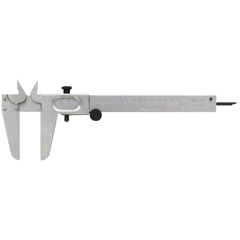 5″ capacity. Inside and outside jaws, full-length depth gauge. Friction roller adjustment. Slide lock. Graduated in 16ths and 32nds with vernier reading of 1/128″.