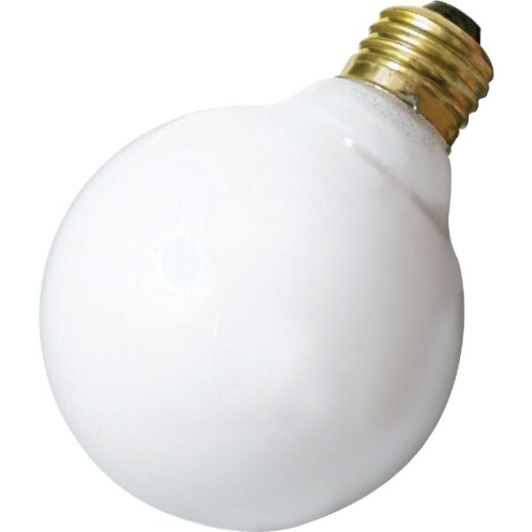 - G40, decorative, incandescent globe light bulb with medium brass base.