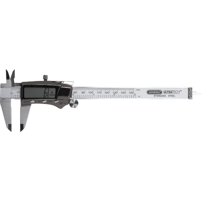6″. Stainless steel design. Tri-mode digital display; inches, millimeters, and fractions. Inside, outside, depth, and step measurements.