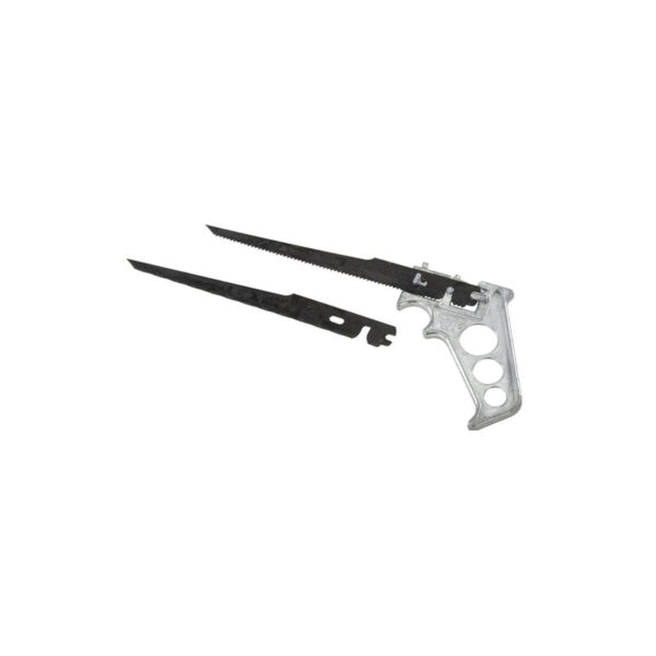 Sharp point, hardened and tempered steel blade with sharpened teeth. Easily cuts through wallboard and synthetic building materials.