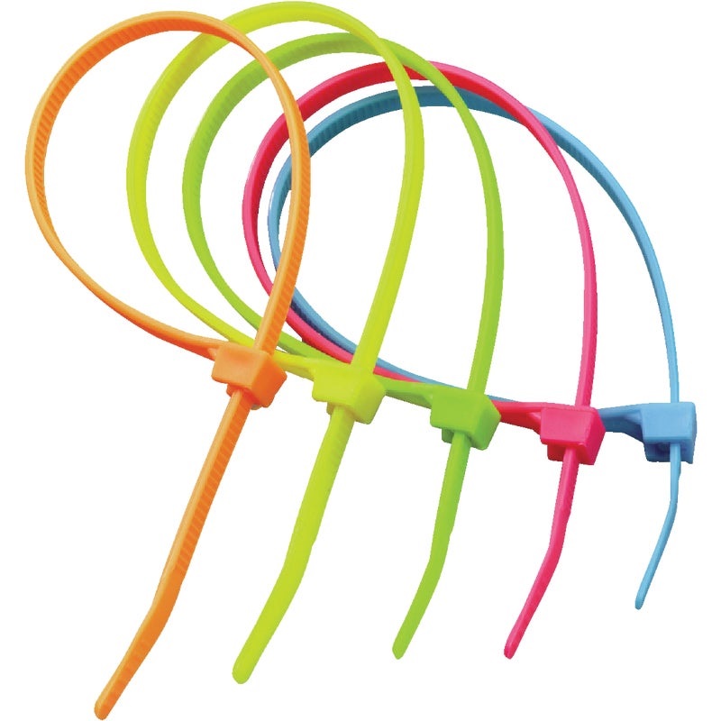 A Gardner Bender 8″ 100pc Cable Tie Multi-Color pack is a set of neon multicolored plastic zip ties that is used for bundling and organizing wires and cords. It features a strong double lock design for extra grip, bent tips for easy insertion, and flexible nylon construction for general household or indoor use.