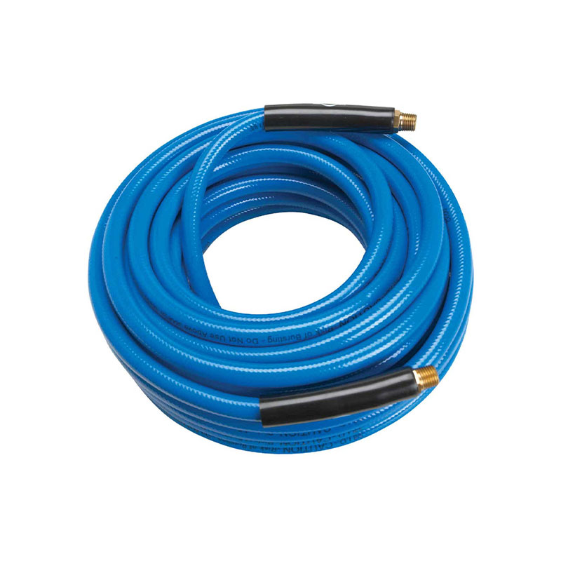 Ideal for general purpose applications, DIY (do it yourself) use, compressor-operated hand tools and air-assisted residential painting equipment. Long-life engineered composition PVC (polyvinyl chloride) hose. Lightweight with a flexible, kink-resistant design and sturdy bend restrictors to increase hose life. Nonconductive and oil and abrasion-resistant. Two year warranty.
