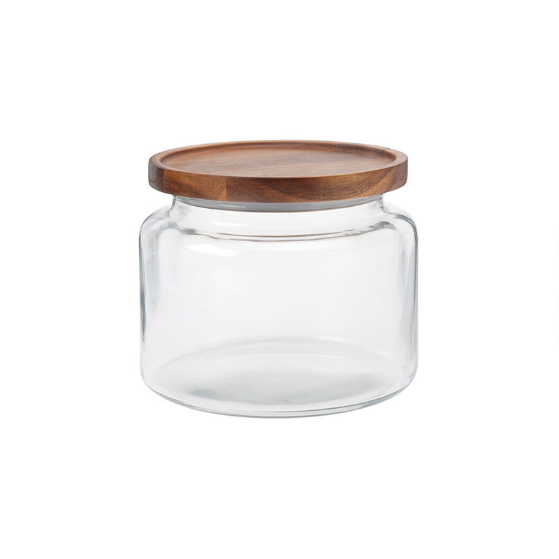 Keep your flour, pasta, coffee grounds, or tea safely stored in your kitchen with this Anchor Hocking Montana 64 oz. mini jar! It can hold your cooking ingredients so that they are easily accessible. It features a flat acacia lid that fits snugly to keep your food safe and for easy accessibility. This jar is made from clear glass so you can easily see its contents. The glass construction also will not absorb odors or stains. Plus, the jar features a classic mini-round design. Use this in your kitchen to keep your condiments and cooking equipment easily accessible.