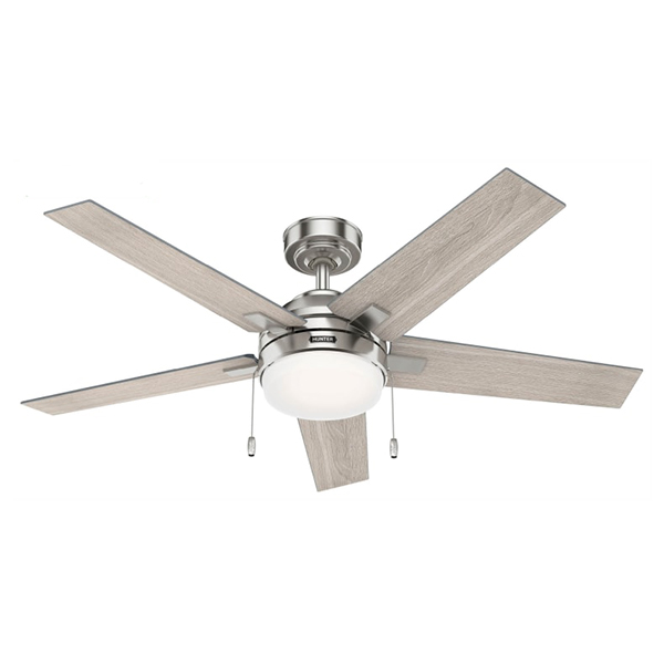 Bartlett Ceiling Fan is designed with a sleek brushed nickel finish paired with light gray oak blades. This 52-inch fan delivers both style and efficient airflow. The integrated LED light provides long-lasting, energy-efficient illumination, making it an ideal choice for living rooms, bedrooms, or covered indoor spaces. It comes with (2 bulbs, 5 gray oak blades, pull chains, standard profile mounting: 2-inch and 4-inch down-rods, and a 3-speed whisperwind reversible motor).