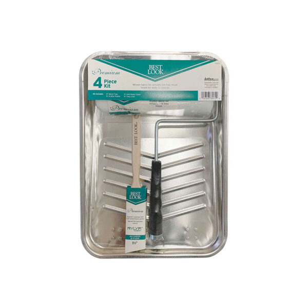 This 4-piece Best Look premium roller and tray set includes: 9 Inch metal tray, 1.5 Inch angle sash nylon brush, 9 Inch x 3/8 Inch woven roller cover and 9 Inch 5-wire roller frame. Woven fabric for virtually lint-free finish. Great for walls and ceilings.