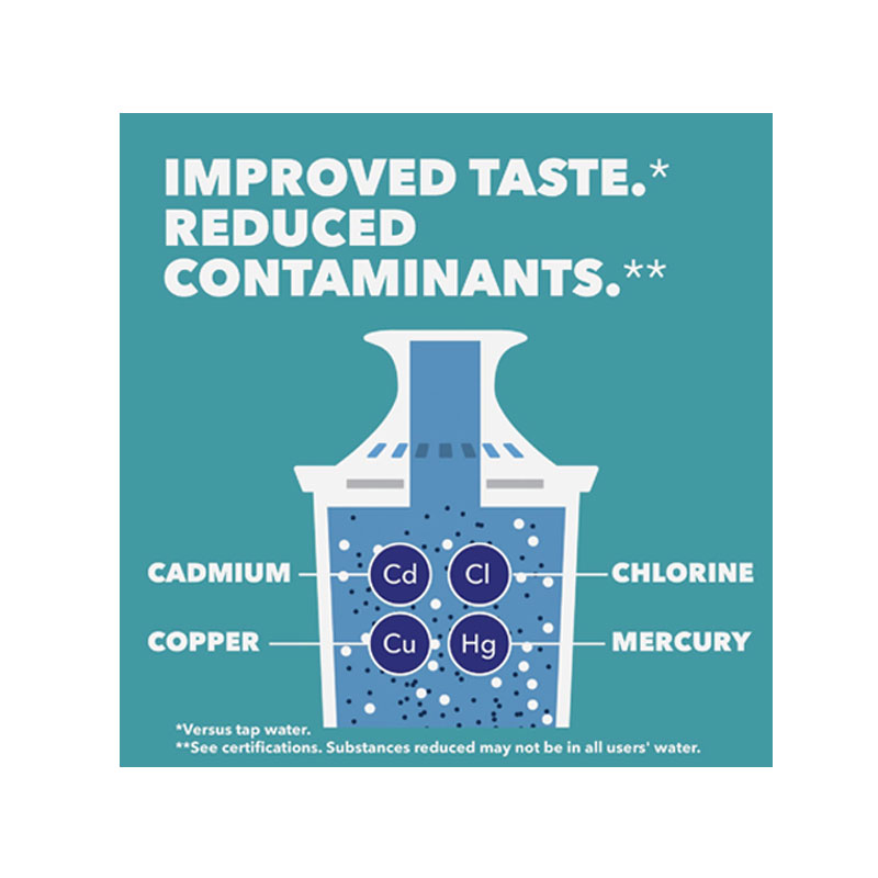 Space efficient design with improved easy-fill locking lid that prevents spillage, and electronic filter indicator to know when filter needs changed. Filters chlorine (taste and odor), copper, cadmium, and mercury. Replace filter every 40 Gal. or approximately every 2 months. BPA free.