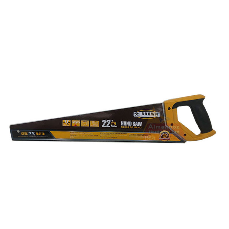 Brown 22 Inch hand saw has 3 cutting edges for faster cutting performance. High-quality steel blade that is stable and ensures maximum power transfer. Water-based lacquer gives four times better rust protection than traditional lacquer. Deeper gullets for enhanced performance and greater volume removal of waste material. The perfect choice for heavy-duty use.