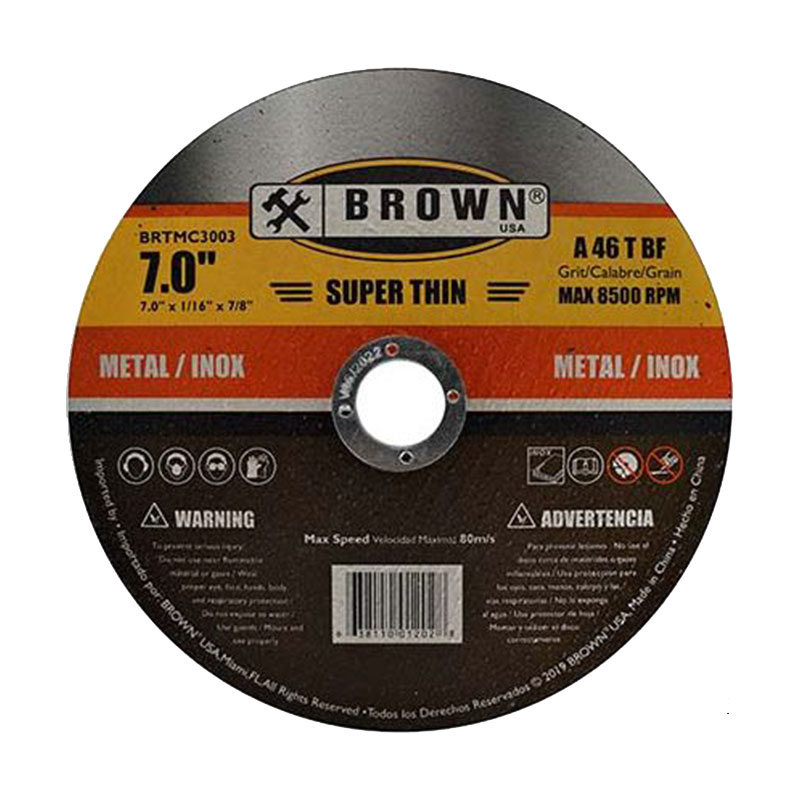 Brown USA Super Thin Metal Cutting Discs is made for optimizing cuts per disc and balanced speed. Featuring a super premium aluminum oxide grain and bond system these discs cut through metal fast. Use these discs for cutting and grinding metal with a gas or cut-off saw. Get these metal cutting blades to help you start cutting how you want to cut today.