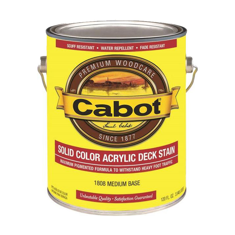 Cabot Solid Color Acrylic Decking Stain is an extremely durable exterior stains for use on all wood decking, outdoor furniture and fencing, as well as cement patios and walkways. 100% acrylic finish is also water-repellent and fade resistant. Solid Color Stains provide excellent adhesion to new, previously stained or painted surfaces, which are in a clean, sound condition. For use on: New or reconditioned wood decks, porches, outdoor furniture, steps, railings and most composite boards.