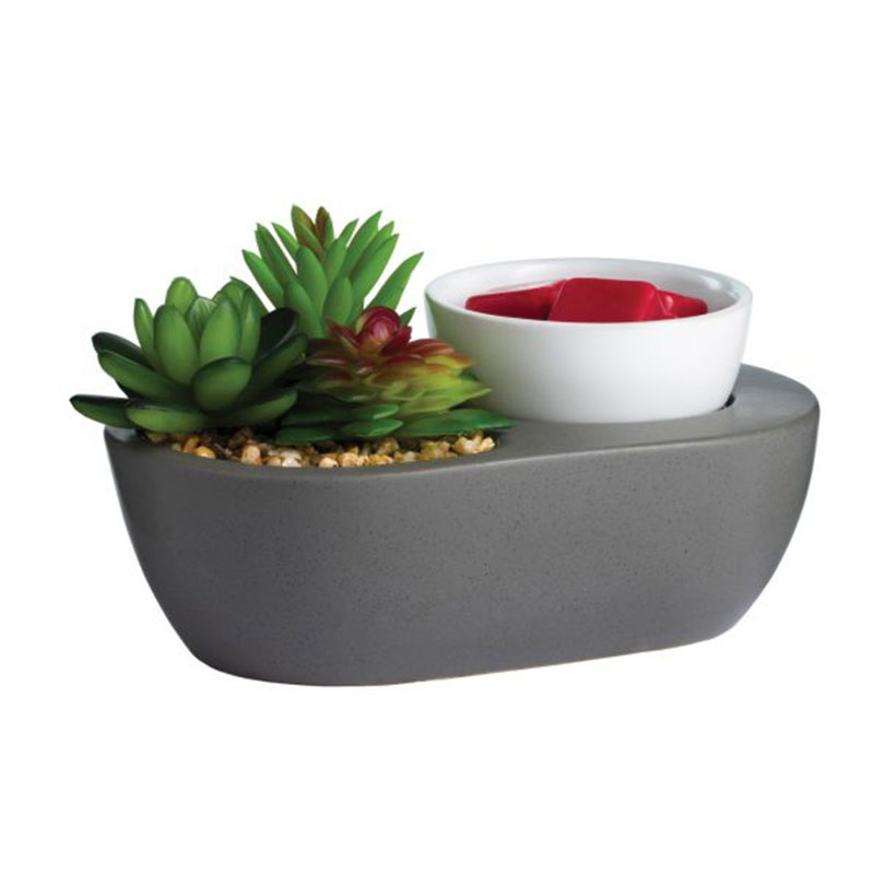 This ceramic warmer is designed with your home decor in mind with its satin-finished grey base which holds a small succulent garden on one side and a white warming dish on the other. It features a trend-focused décor incorporated with a wax warmer, giving you more style with your home fragrance.