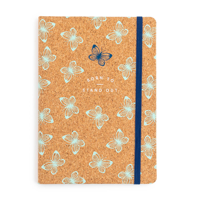 Core Home Cork bound journals are ideal as a diary, writing journal, poetry journal and more. This custom notebook features a cork-like cover with a butterfly design on the cover and color-matching elastic closure.