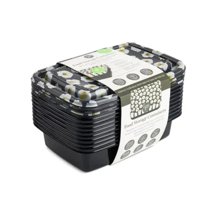 Keep your food fresh and organized with this 24-piece colorful food storage container set while adding a pop of color to your kitchen. Features a daisy floral pattern with bold black and white coloring. Designed with convenience and durability in mind, includes sturdy, airtight lids with easy-open tabs and can be stacked for easy space-saving storage. Holds approximately 33.8 ounces.