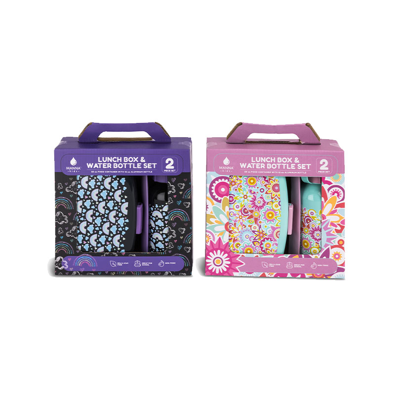 This Manna Kids Lunch Box & Water Bottle Set includes a 20oz food container with a 12oz aluminum bottle. The container features a removable divider for fruits, vegetables, and snacks. Very attractive colours and designs perfect combo gift set for your little ones. BPA, Lead-Free and Non-Toxic. Available in 2 colors. Pink and Purple.