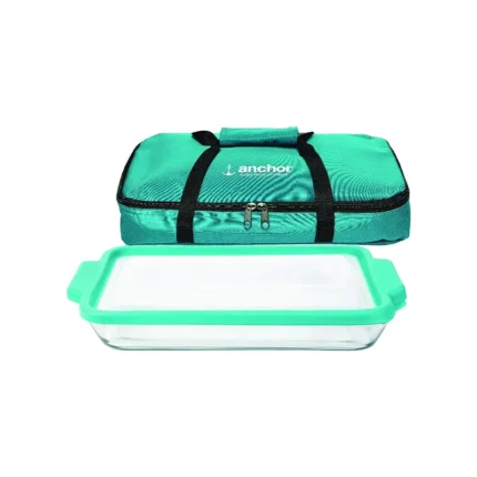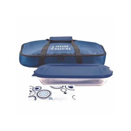 The Anchor Hocking Bake-n-Take Set includes four tempered glass pieces in blue, including a 2-1/4-quart rectangular baking dish and lid, a 1-1/2-quart round casserole and lid, a 2-1/4-quart oval oven dish with lid, and a 1-quart oval cover with handle. All of these dishes are microwave-safe and can be used in the oven up to 350 degrees Fahrenheit or in the freezer.