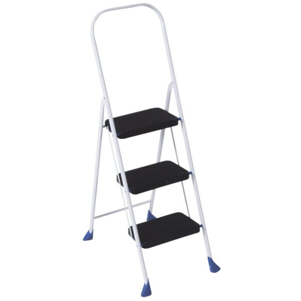 2 heavy-duty injection molded polypropylene resin steps for comfort and durability. Ribbed, slip-resistant step treads. Convenient handle for carrying ease. Opti-Bond powder-coat finish. Continuous rear leg support for added strength. Specially designed saddle tips provide lateral rigidity. Large nonmarring leg tips protect floor surfaces. Meets ANSI standards for Type III Light Household Duty Rating 200 lb (pound). No assembly required. Step stool open: 17″ W x 18″ D x 28.15″ H. Step stool folded: 17.32″ W x 3″ D x 31″ H. Step size: Bottom 13-1/8″ W x 5-1/4″ D, top 12″ W x 10-1/2″ D. Color: Cool Gray & Black. 10 year limited warranty.