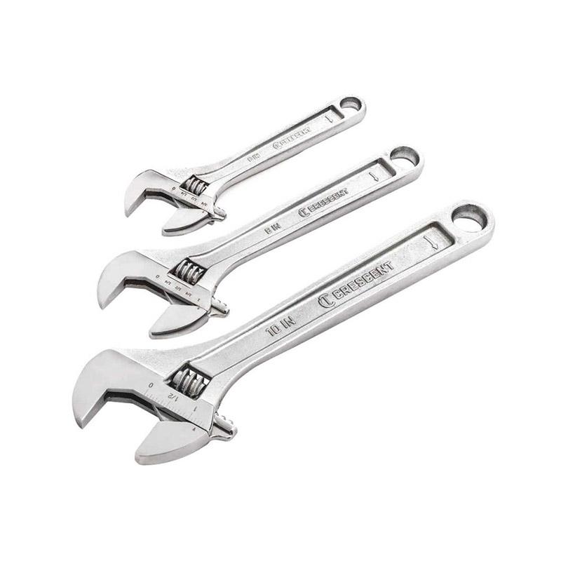 The Crescent Adjustable Wrenches all feature a large knurl for easy adjustment and a tight jaw fit. Their hex jaw design helps reduce slippage and tightly grips the fastener for solid, secure operation, while the corrosion-resistant chrome finish helps prevent rusting.