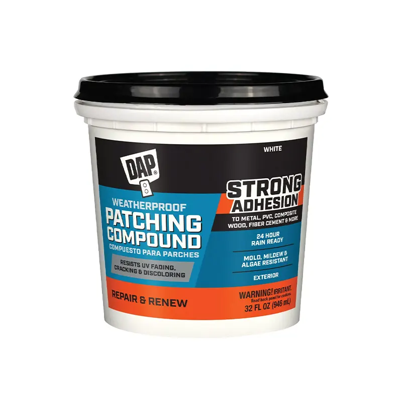 DAP Weatherproof Patching Compound is formulated with innovative Weather Max Technology for long-lasting, all-weather protection. Weatherproof Patching Compound provides exceptional weatherproof protection that prevents discoloration, cracking and crumbling. The tough hydrophobic surface provides a waterproof repair that won’t swell, soften, blister or breakdown and it is mold, mildew & algae resistant making it perfect for areas with continuous exposure to the elements.