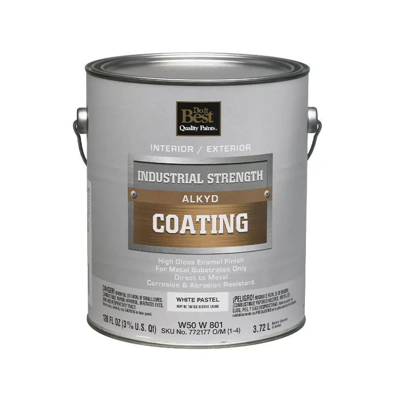 New and improved interior/exterior, direct to metal (DTM), alkyd (oil base) gloss coating. It is designed for industrial maintenance and construction purposes. Use on machinery, farm implements, fixtures, conveyors, safety equipment, and doors. Provides excellent rust and corrosion resistance. Acceptable for use in federally inspected meat and poultry plants. Remove any loose rust, dirt, dust, and oil from the surface to ensure adequate adhesion. For better adhesion, prime bare steel or iron with Do it Best alkyd industrial primer, Model No. W50W90 before applying alkyd industrial topcoat. Prime aluminum or galvanized steel with Do it Best waterborne industrial primer, Model No. W66W900 (SKU 772079) before applying alkyd industrial topcoat. Masonry and block surfaces must be cured for at least 28 days. Clean and fill holes with block filler before applying alkyd industrial coating. Wood must be clean, dry, and sound before applying alkyd industrial coating (self-priming). Apply with brush, roller, or airless sprayer. Clean up with Xylene. Dries to touch in 2 hours, to recoat in 8 hours. Covers approximately 200 to 350 sq. ft. per gallon.