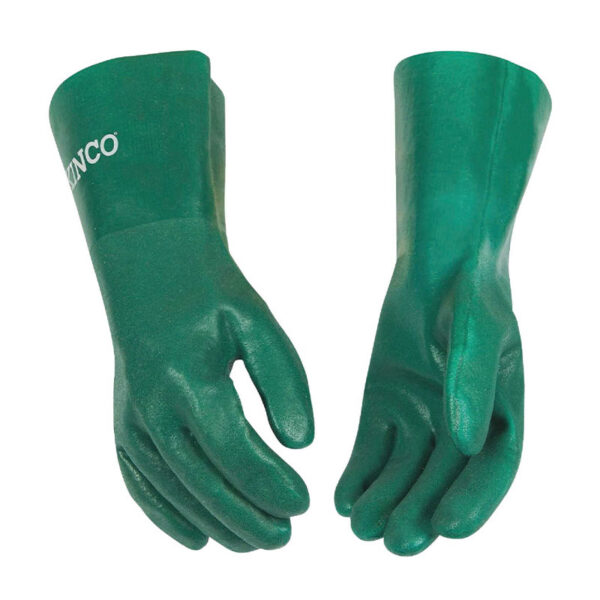 Kinco Men's Large Fully-coated green PVC (polyvinyl chloride) glove features a sandy finish with cotton interlock lining for comfort. The 14-inch gauntlet cuff adds extra protection. Ideal to use for chemical handling, industrial cleaning, irrigation and pipe applications, or janitorial work. Includes a flexible wing thumb design.