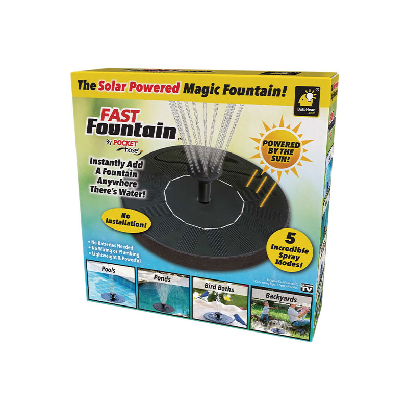 Solar powered fountain can instantly be added anywhere there is water. No installation, batteries, wiring or plumbing needed. Great for pools, ponds, bird baths and more. 5 spray nozzles included.