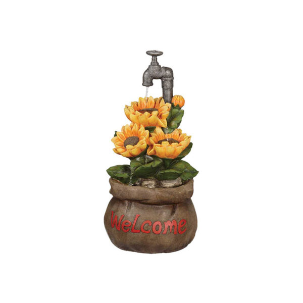 Durable outdoor fountain featuring a faucet pouring into a sack of sunflowers. Ideal for any flowerbed, garden, landscape or outdoor area. Comes complete with a water pump. Weight: 16 pounds. Size: 13 Inch W. x 28 Inch H. x 13 Inch L.