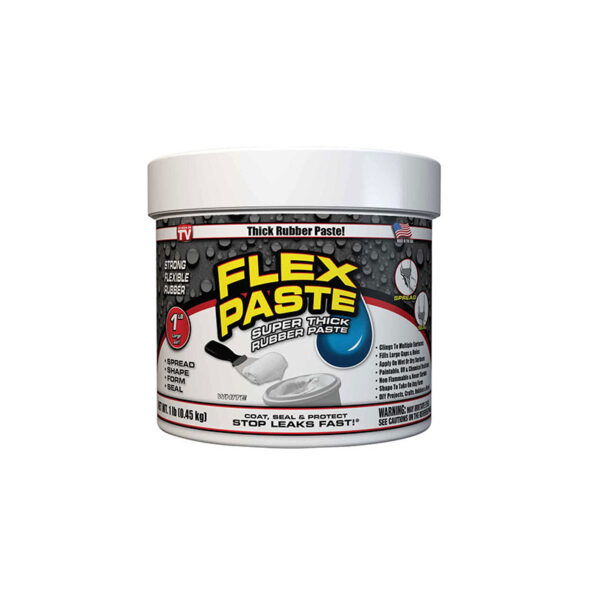 Flex Paste is a thick Paste that can be applied most surfaces, including underwater and dries to flexible rubber. Coat, Seal and Protect. Super thick Rubberized Paste clings to surfaces and instantly fills gaps. Expands and contracts and never shrinks. Paintable. Non-Flammable, chemical and mildew resistant. Flex Paste clings to a wide variety of surfaces.
