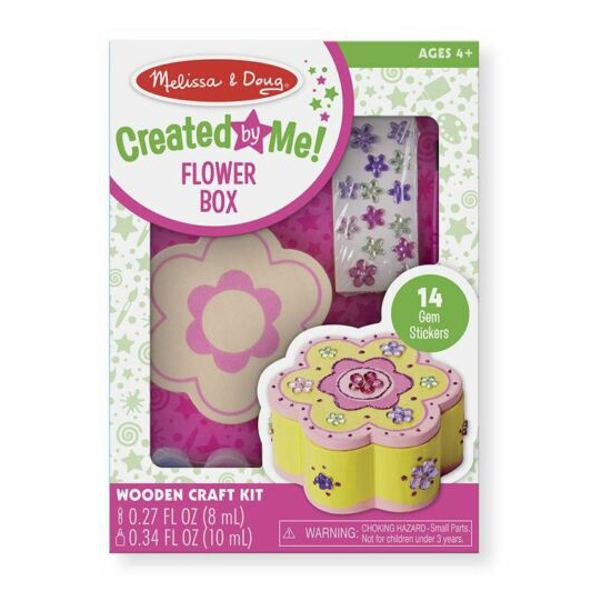 The Melissa & Doug DYO Flower Chest is cute set to make your own trinket box. Floral fans can create their own special spot for storing treasures with this Flower Chest. Includes a sturdy wooden flower-shaped box, glitter glue, white glue, colorful gem stickers, 4 pots of paint, and a paintbrush. A perfect activity for parties or rainy days.