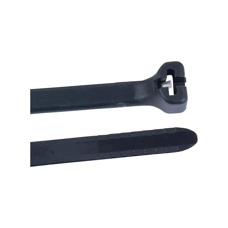 Self-cutting nylon cable tie. Easy to use; simply lock and twist to finish the job, with no need for an additional cutting tool. Unlike other twist ties this patented design doesn't require a reduction in the strength and durability of the cable tie material or multiple rotations to achieve a break in the tie. Instead, a small cutting blade designed into the head of each tie ensures a tight lock and quick, clean cut.