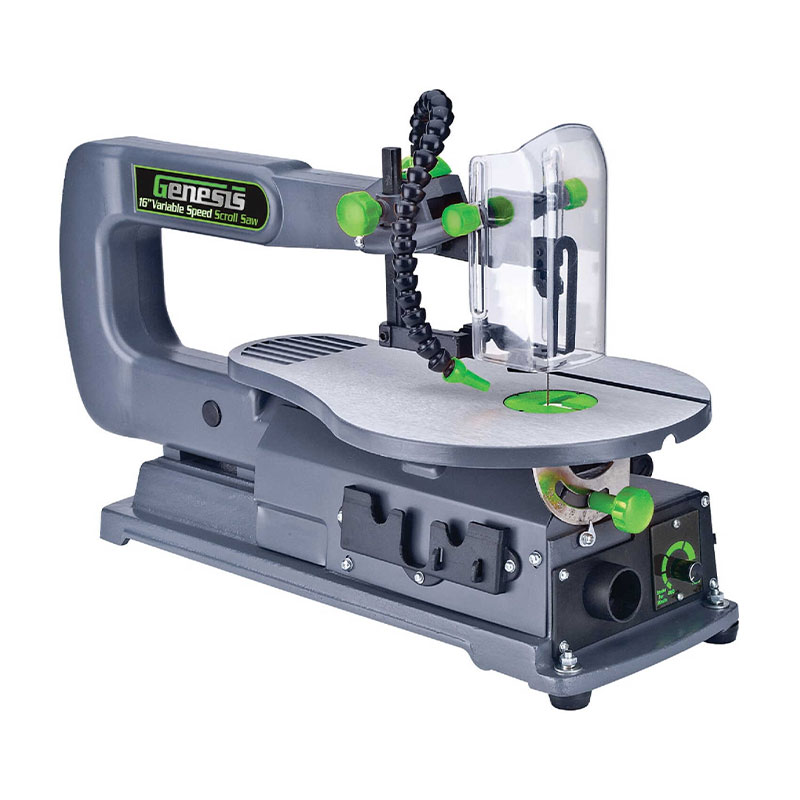 Variable speed scroll saw featuring 1.2 Amp induction motor for quiet, smooth performance. Flexible dust blower keeps cut line free of debris. Electronic variable speed control helps cut a variety of materials. Cast aluminum 14-1/8 In. x 10 In. table tilts left or right. Tilting range: Right 15 degrees, Left 45 degrees. Built-in dust port keeps work area clear of dust. Quick-change blade system for fast, easy blade changes. Accommodates all 5 In. and 5-1/4 In. pin-end scroll saw blades. Includes 2 blades (5-1/4 In. x 1/10 In., 18 TPI) and wrenches.