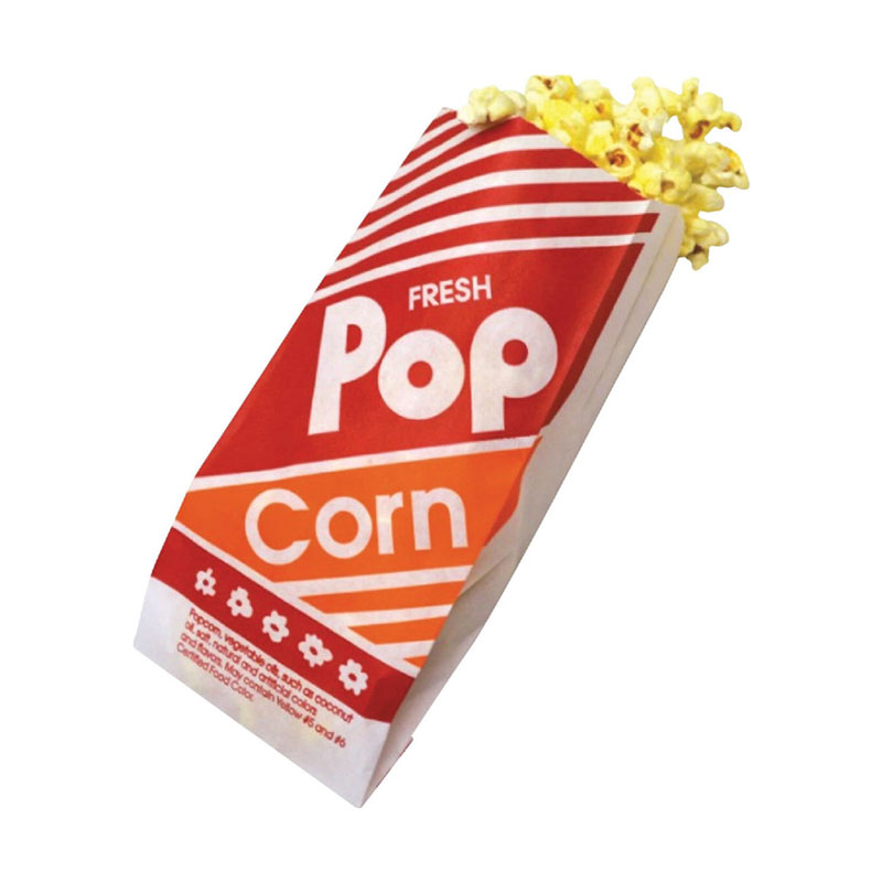 This brightly colored popcorn bag is just right for small servings or samples. These Popcorn Bags hold 1.1 oz. of popcorn and are packed in 1,000 bags per case.