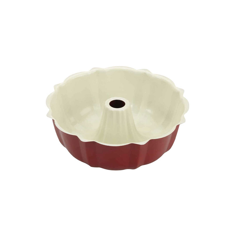 This aluminum cake pan has grooves on the bottom to make an elegant ribbed texture on the surface of traditional cakes. Heavy-duty non-stick coating – safe for metal utensils. Red exterior with a cream color interior. Dishwasher safe. Lifetime warranty.