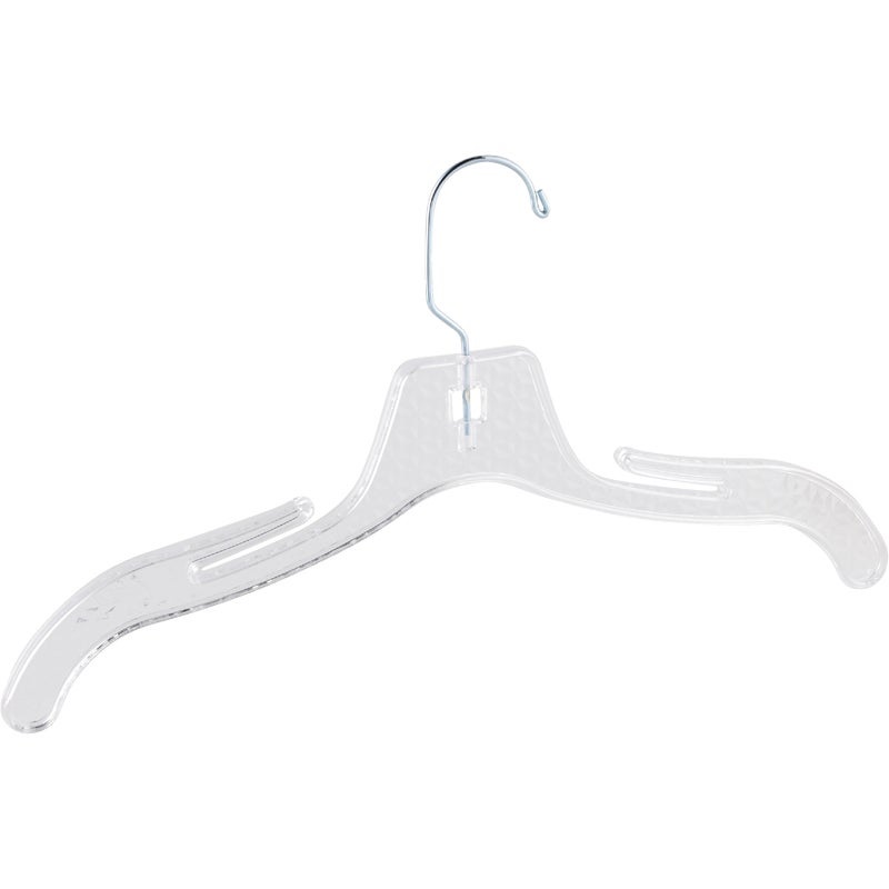4 heavyweight crystal cut dress hangers with matched shoulder design. Shoulder strap notches. Revolving metal hook. Clear plastic.