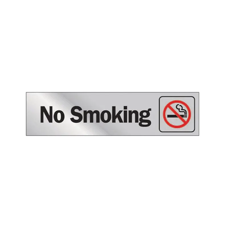 Keep the air clear in a designated area by installing this “No Smoking” sign. Ideal for restaurants, schools, private businesses and parks. Features silver background, sign is self adhesive for easy mounting and attaches to most surfaces.